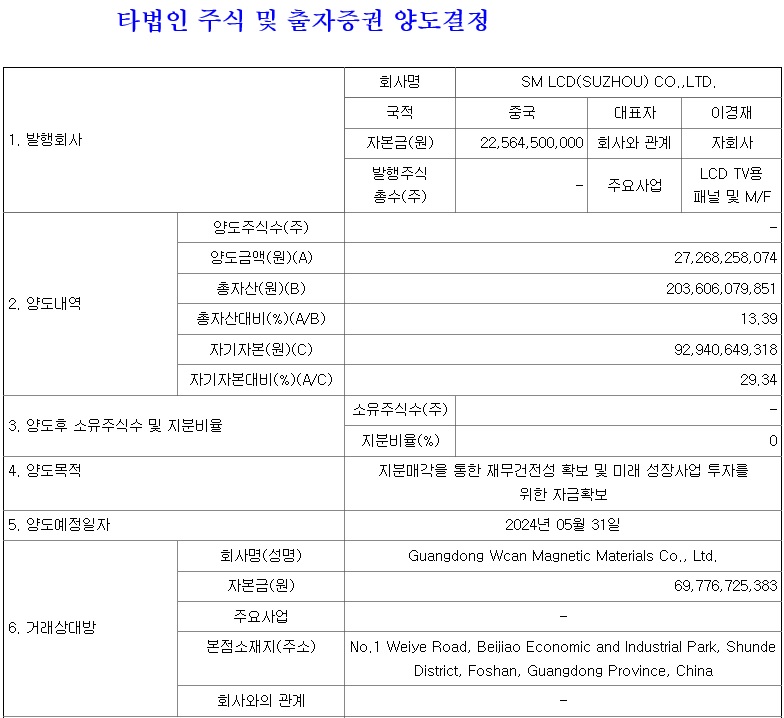 이경재 회장 시기의 과거 부실을 한꺼번에 회계에 반영하면서 대규모 손실을 기록했는데 이를 메꾸기 위해 중국 투자법인인 SM LCD의 지분 매각을 결정했지만 투자비에 못 미치는 손해 보는 가격에 매도하면서 매각 대금의 유입도 여러번 변경하는 한심한 모습으로 일관하고 있습니다