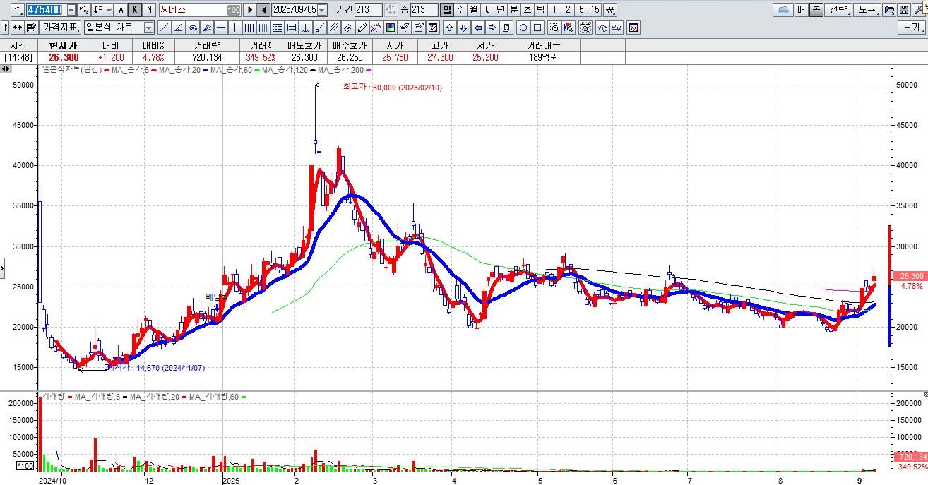 씨메스는 기대감으로 주가가 오르기 때문에 언제든지 차익실현 매물에 흘러내릴 수 있습니다