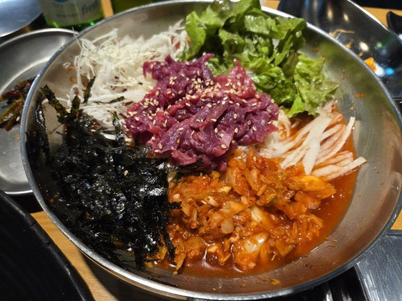 동네후배가 육회묵은지국수를 주문해 맛만 좀 봤는데 시원하고 달달한 맛이 고기와 함께 드시면 딱인 국수였습니다