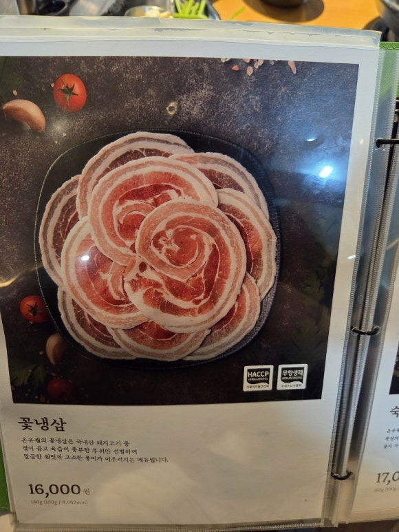 이번에 처음가서 꽃냉삼을 2인분 주문했는데 양도 푸짐하게 나오고 솥뚜껑도 화력이 좋아서 금새 잘 익어 먹기 편했습니다