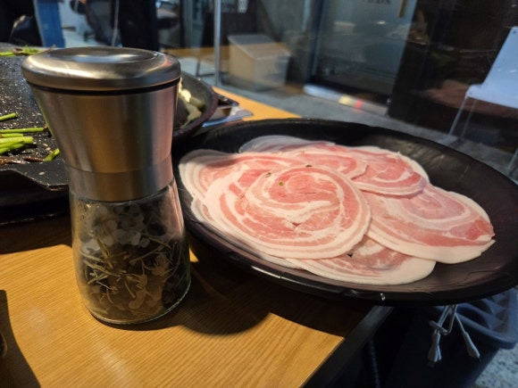 동네 후배와 오붓하게 삼겹살에 반주하는 자리를 가졌는데 규모는 작지만 사람들이 많아도 대화하는데 전혀 문제 되지 않을만큼 테이블 거리가 있어 맛난 삼겹살과 대화를 즐길 수 있었습니다