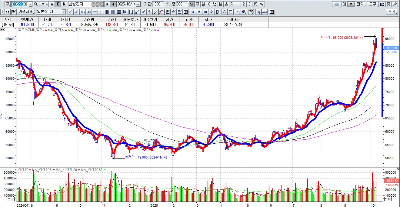 삼성전자는 3분기 실적 공개 후 주가가 최고가 96,000원을 찍고 흘러내리는 모습을 보였는데 오후장에 최조가 90,200원을 찍기도 했습니다