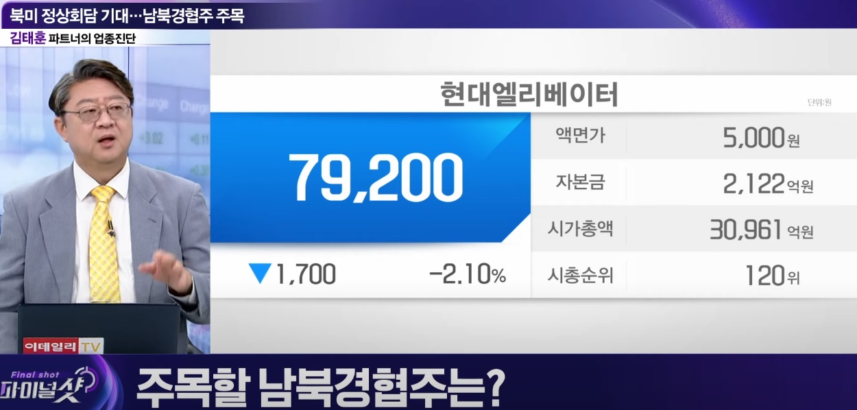 현대엘리베이터는 대북사업을 총괄하는 현대아산의 최대주주로 다시금 남북관계가 정상화되고 대북사업이 재개될 경우 가장 큰 수익을 누리게 될 종목으로 알려져 있습니다