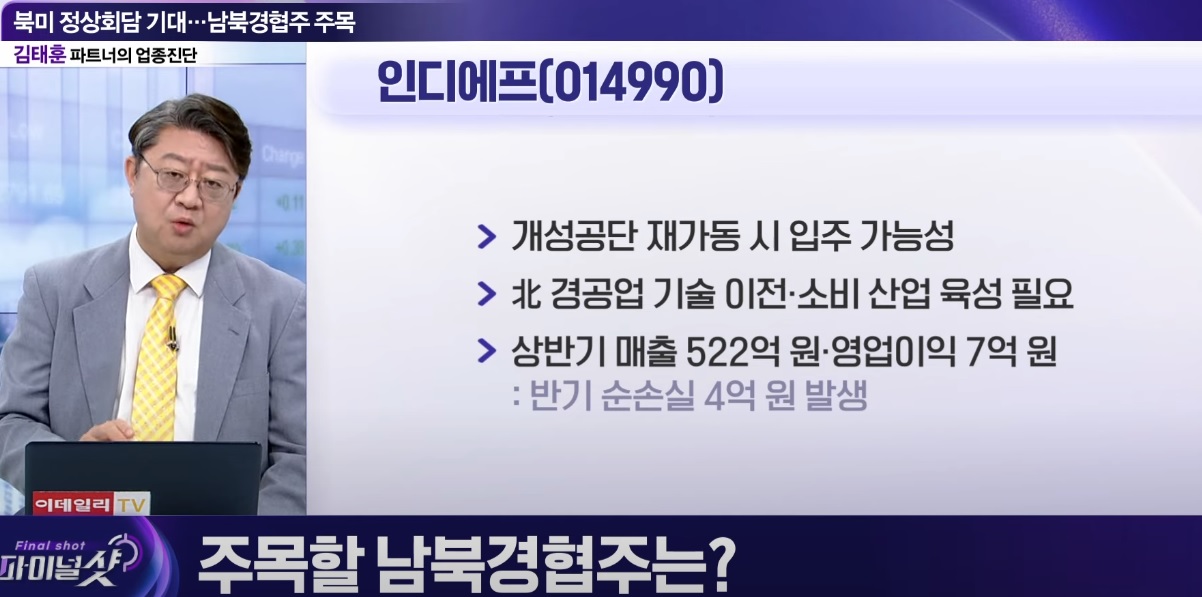 인디에프 개성공장이 운영될 때 가격경쟁력이 중국과 베트남에 앞설 뿐 아니라 물류비용에서도 유리해 큰 수익을 내며 성장을 이어갔었던 종목으로 이번에 다시 개성공단이 재가동될 경우 다시 진출하여 조기에 수익성을 회복할 수 있을 것으로 기대되고 있습니다