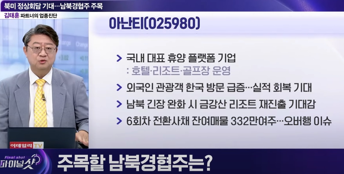 남북경협주에서 가장 먼저 고려해야 할 것은 아난티로 예전 금강산관광 관련 금강산 호텔과 리조트 그리고 골프장을 운영해 본 이력이 있는 회사입니다