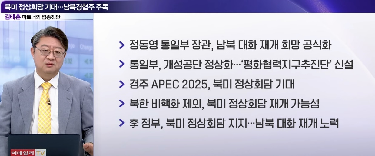 이런 대형주 장세에서 비싸보이는 주가에 손이 나가지 않는다면 테마주에서 틈새시장을 찾을 수 있는데 이번 달 말에 있을 경주 APEC 2025에서 미국 트럼프의 방한은 1박 2일 일정으로 이뤄지기 때문에 트럼프와 김정은의 만남 가능성이 정동영 통일부 장관의 입에서 나오기도 했습니다