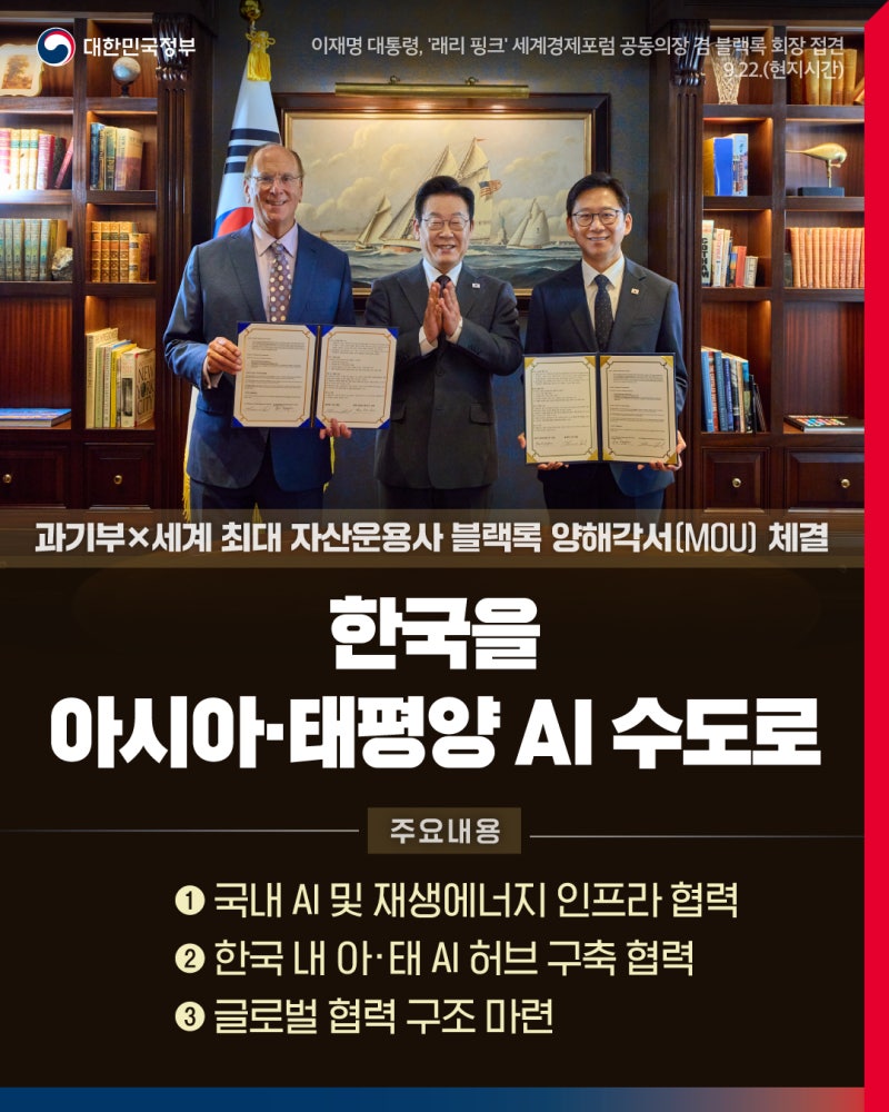 | 이재명 정부 블랙록 계열 뷔나그룹 20조 투자유치 MOU 체결 (0) | 2025.10.24 |