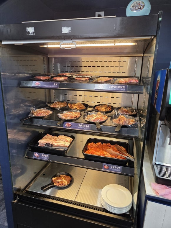 "명륜진사갈비 종로관철점"은 무한리필 고기가 나오는 곳과 샐러드바가 있어 이용하기 편리했는데 껍데기만 따로 직원분에게 요청하는 것이고 나머지 고기는 고기가 나오는 곳에서 자유롭게 갖다 구워먹으면 됩니다