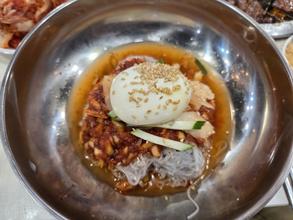 돼지갈비를 여러차례 갖다 먹고 마지막 껍데기로 입가심 했는데 비빔냉면으로 식사를 했는데 맛도 있고 양도 적당해 좋았습니다