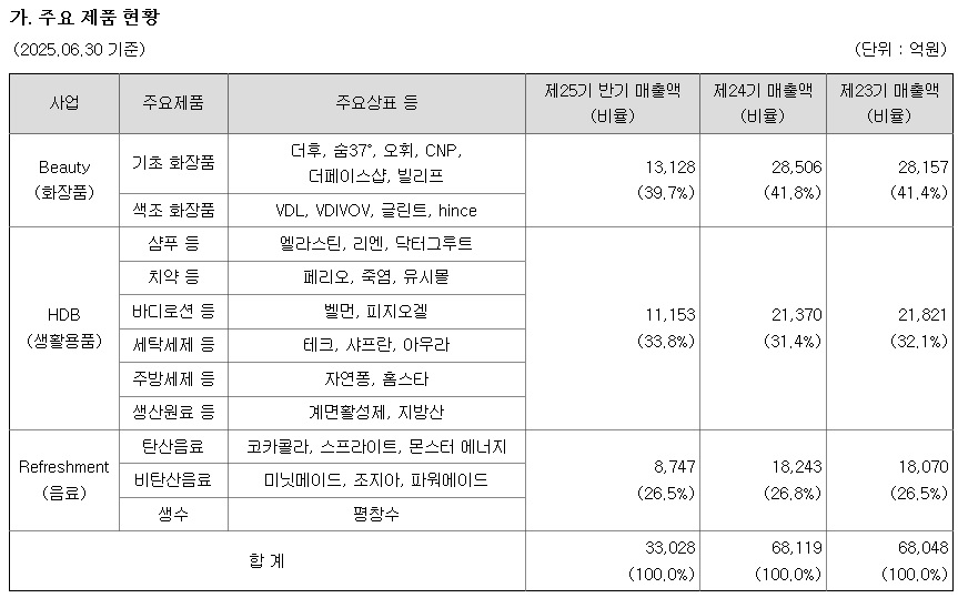 화장품 사업은 매출 4710억원, 영업적자 588억원을 기록했는데 대규모 물량 조절로 면세 매출이 급감했고, 이에 따른 비용 부담으로 적자를 낸 반면 CNP, VDL, 힌스 등 MZ세대 중심 브랜드는 신제품 출시를 이어가며 매출 확대에 주력하고 있습니다.
