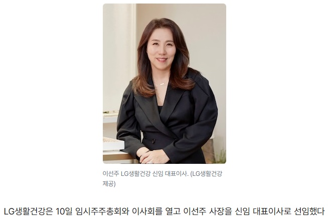 LG생활건강은 10일 임시주주총회와 이사회를 열고 이선주 사장을 대표이사로 선임했다고 공시했는데 이 신임 대표는 글로벌 화장품 업계에서 30년 이상 경력을 쌓은 마케팅·브랜딩 전문가로 앞으로 공격적 마케팅에 나설 것으로 예상되고 있습니다