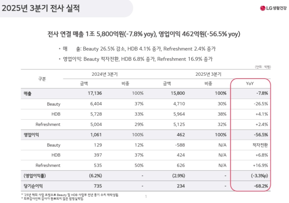 LG생활건강은 올해 3분기 연결 기준 매출은 1조5800억원, 영업이익은 462억원으로 전년 동기 대비 각각 7.8%, 56.5% 감소했다고 10일 공시했습니다.