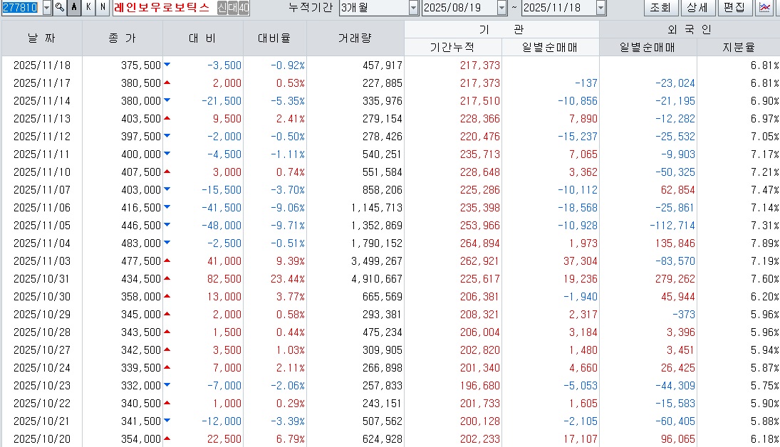 두 사람의 AI반도체와 피지컬Ai 전문가들의 발언으로 엔비디아와 삼성전자의 휴머노이드로봇 개발 협력에 대한 기대감을 키워주고 있고 2족 보행로봇 중 국내에서 가장 앞서 있는 레인보우로보틱스가 수혜주가 될 것이라는 인식이 장 막판 매수세를 불러모으며 주가를 급등시키고 있습니다