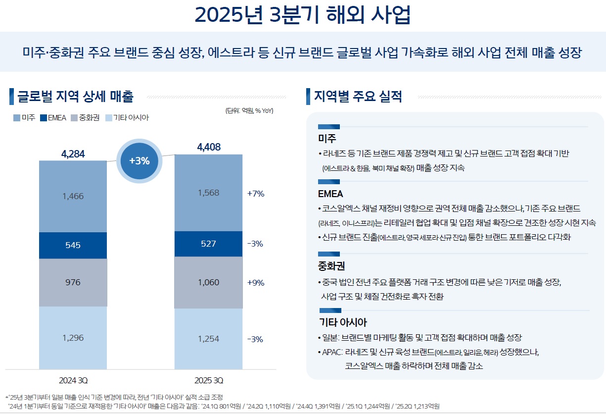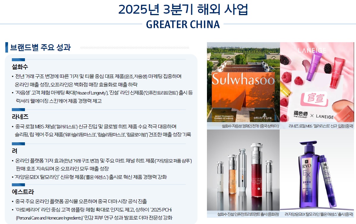 라네즈·에스트라·설화수·려 등 주요 브랜드의 글로벌 확산과 운영 효율화에 힘입어 매출 성장과 수익성이 개선됐습니다