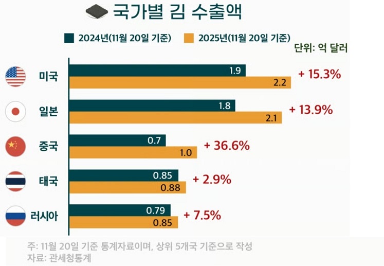 | 수산주 김 수출 10억달러 돌파 중국 한일령 발동 반사이익 기대감 (0) | 2025.11.23 |