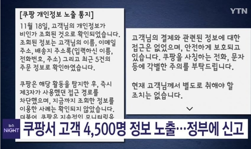 쿠팡은 지난 18일 고객 4500명의 개인정보가 무단 유출된 사실을 확인하고 경찰청, 한국인터넷진흥원, 개인정보보호위원회 등 신고했다고 밝혔습니다.