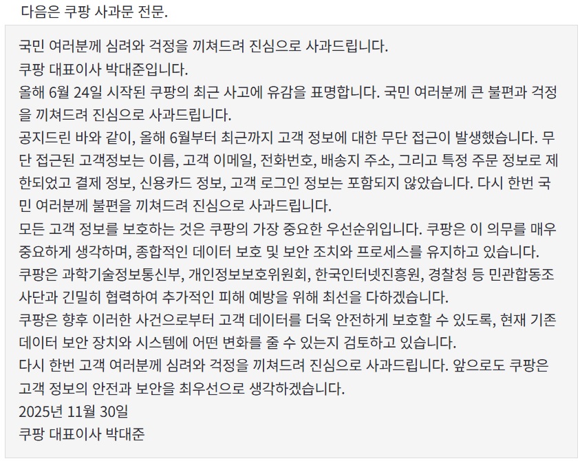 추가 조사에서 추가 피해가 밝혀질 가능성도 배제할 수 없는 상황인데 쿠팡은 무단 접근 경로를 차단 했으며 내부 모니터링을 강화하고 있다고 주장하고 있습니다