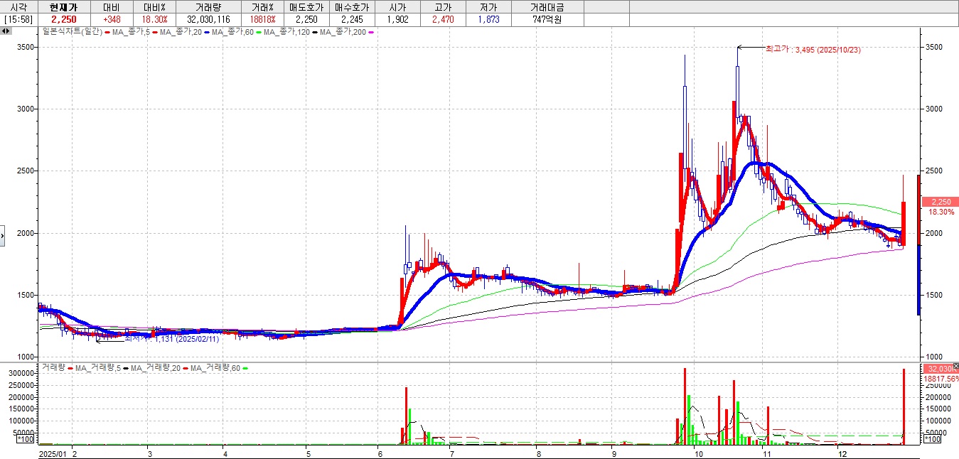 삼라마이다스측 지분율이 87.58%에 달해 소액주주 비율이 약 15% 미만에 불과한데 전형적인 품절주 모습을 보이고 있습니다