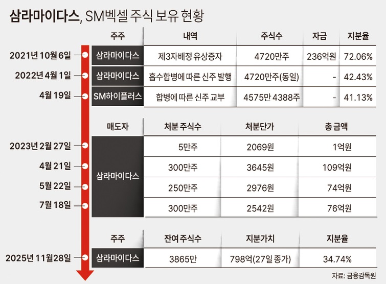 삼라마이다스는 우 회장과 우 대표가 각각 지분 74.01%, 25.99%씩을 보유하고 있는 개인회사나 마찬가지인데 이번에 에스엠벡셀의 지분을 매각하여 삼라마이다스 결손금 894억원에서 339억원으로 축소될 것 같습니다