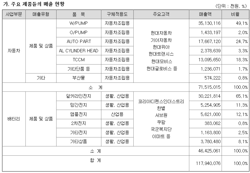 자동차사업부는 자동차 부품제조 전문회사로서 Water Pump, Oil Pump, Auto Part및 AL Cylinder Head 등 자동차 엔진 및 미션계통의 제품을 생산하여 국내외 완성차업체 및 부품전문기업(현대자동차, 기아자동차, 현대모비스 외)등에 공급하고 있습니다.