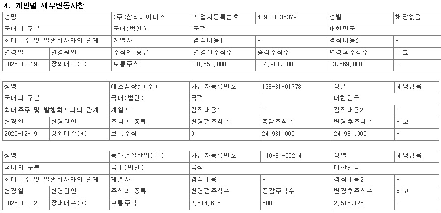 삼라마이다스가 보유하고 있던 지분을 매각해도 여전히 경영권은 삼라마이다스그룹이 보유하고 있는데 특수관계인들 사에에 주식매매이기 때문입니다