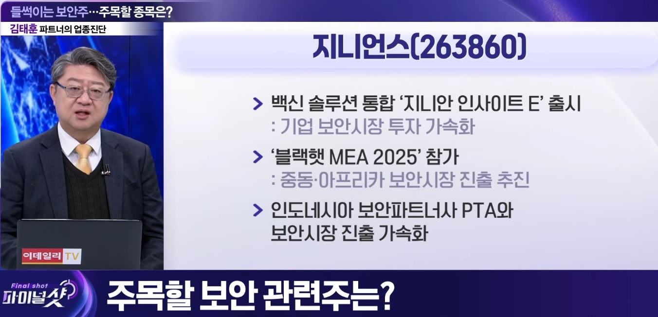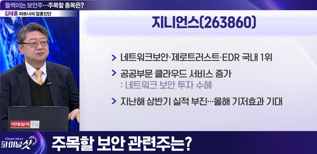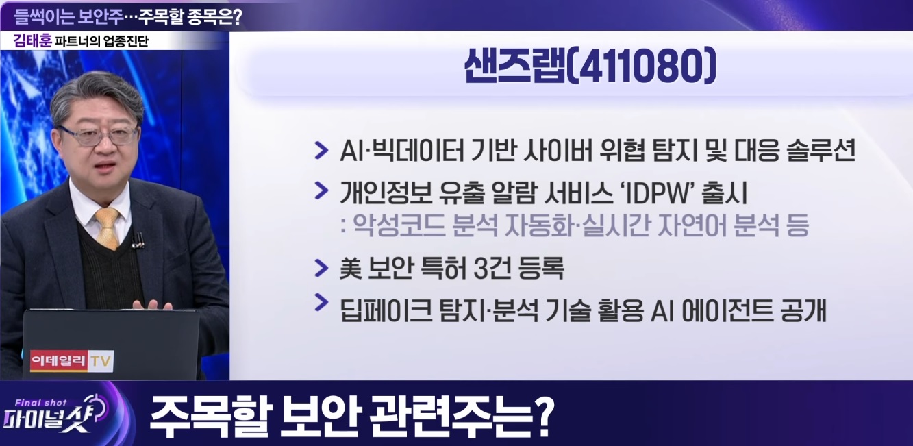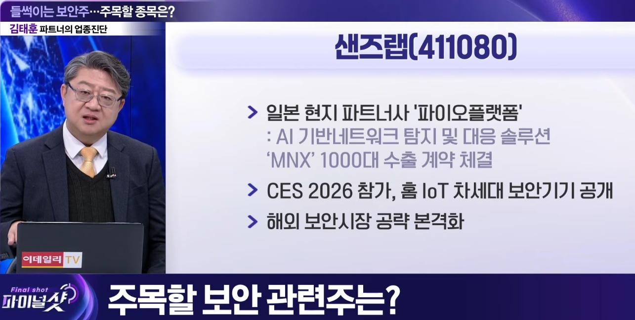 | 이데일리TV 김태훈의 업종진단 2026년 1월 27일 방송 보안주 지니언스 샌즈랩 한싹 (0) | 2026.01.29 |