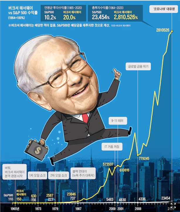 버크셔 주식의 누적 상승률은 버핏이 버크셔 경영권을 인수한 1965년부터 이날까지 60년 동안 약 610만%에 달했는데 이는 같은 기간 스탠다드앤드푸어스(S&P)500 지수의 배당 포함 수익률(약 4만6000%)을 크게 웃도는 수준으로 버크셔의 1965~2024년 연평균 주가 상승률은 19.9%로 추정되어 버크셔해서웨이 주식만 갖고 있어도 부자가 될 수 있었던 시대를 살게 해 주었습니다