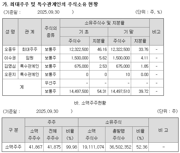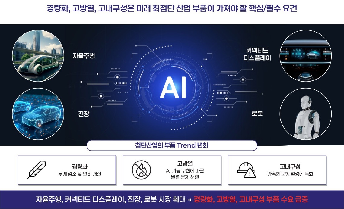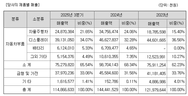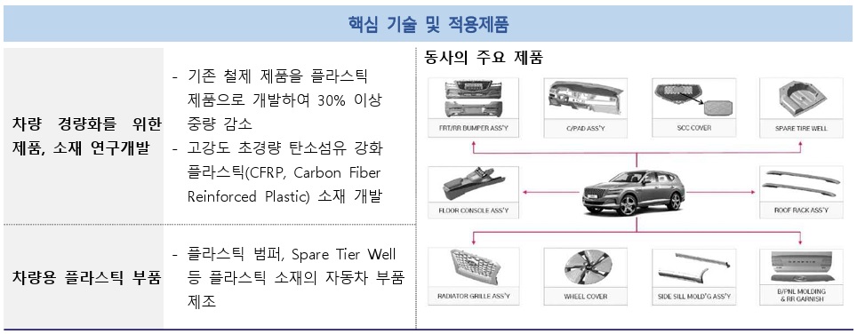 국내 본사(인천 남동공단)와 베트남 생산법인을 기반으로 글로벌 고객사 대상 양산체계를 구축하고 있고 주요 사업영역은 자율주행 센서 하우징, 커넥티드 디스플레이 프레임, 전장시스템 케이스 및 로봇용 구조 부품 등으로 올해 3분기 매출 비중은 △자율주행 22% △디스플레이 34% △금형 및 가전 33% △배터리 5% △기타 6%로 구성되어 있습니다