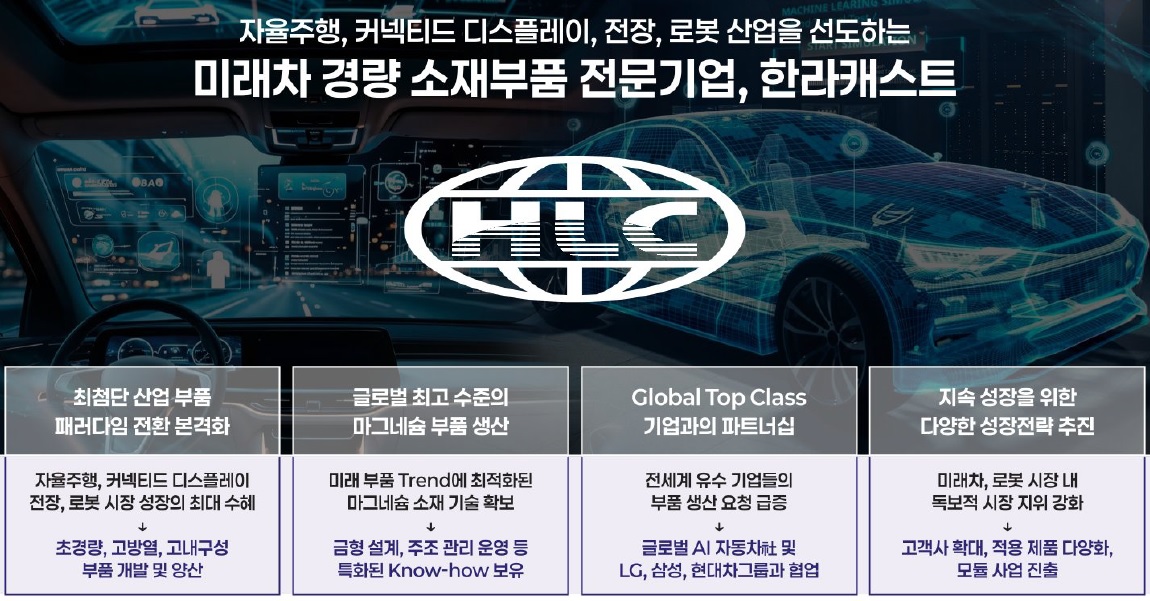 한라캐스트는 글로벌 AI 자동차향 자율주행 및 전기변환 부품 수주를 확보했으며, 휴머노이드 로봇 부품까지 사업영역을 확대 중에 있는데 누적 수주잔고는 1조원 이상으로 고객 다변화와 모듈 단위 공급 확대로 성장을 이어갈 것으로 기대되고 있습니다