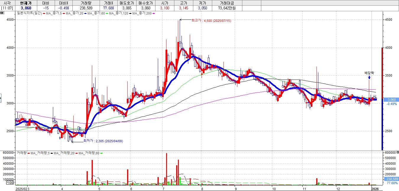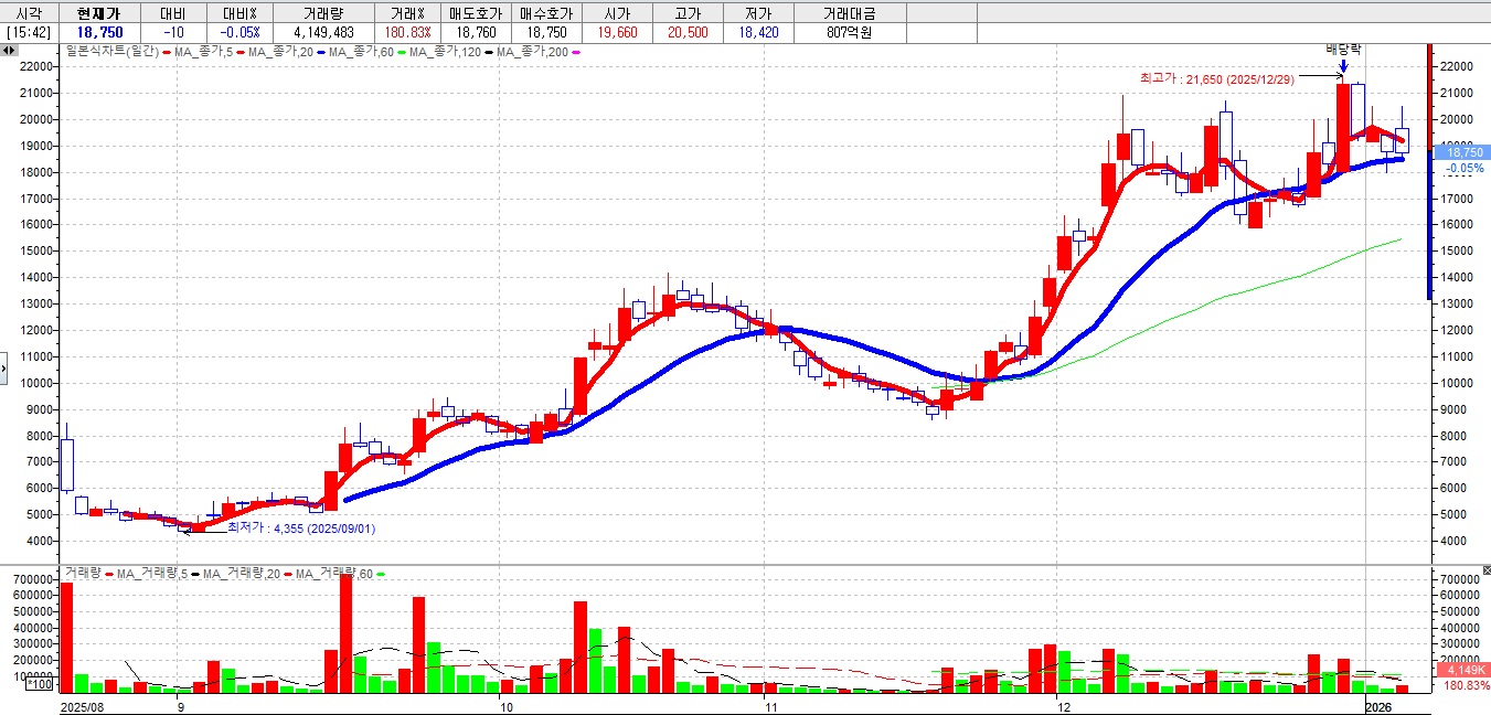 지난 해 8월 공모가 5,800원에 상장 한 이후 지난해 9월 1일 4,355원을 바닥가격으로 꾸준히 급등하여 지난 해 12월 29일 최고가 21,650원을 기록하기도 했습니다