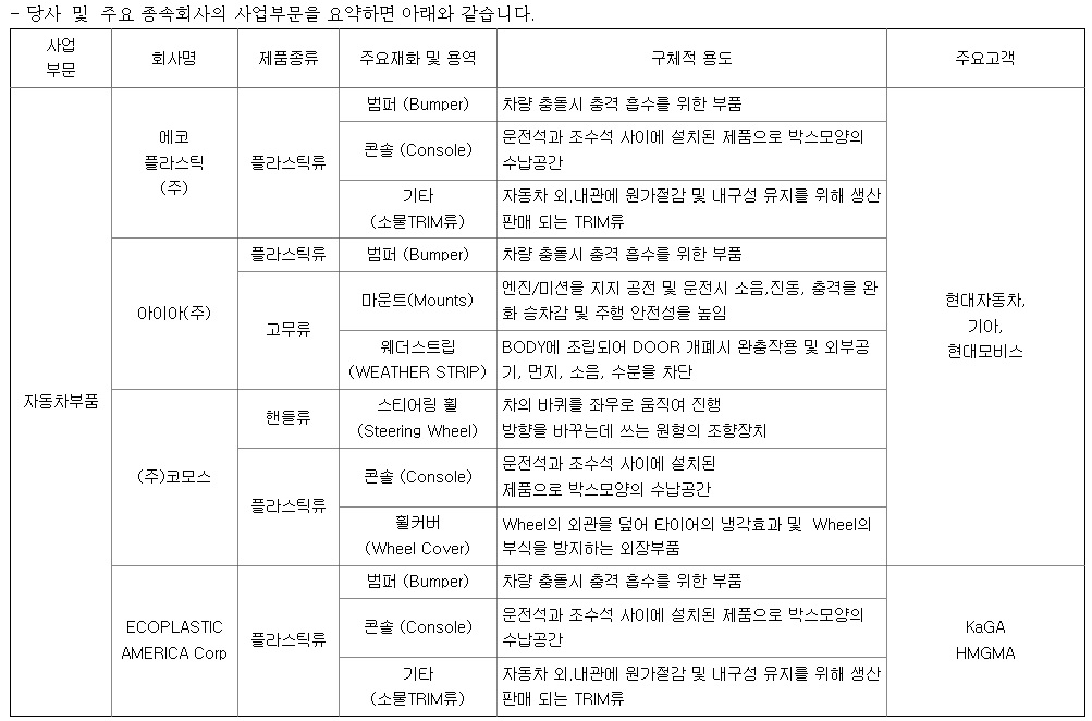 국내 전장 핵심 고객사와 글로벌 인공지능(AI) 자동차사를 주고객사로 두고 있는데 현재 자동차부품 모듈 제조업체인 LG전자, 현대모비스, 삼성전기 등을 통하여 메이저 완성차 업체인 현대자동차, 기아자동차, 벤츠, BMW, 아우디, 랜드로버, 르노, 볼보, 스텔란티스, 재규어, 폭스바겐, GM 및 글로벌 AI 자동차 업체에 공급되고 있고 이들을 대상으로 고난도 다이캐스팅 및 금형 내재화 기반의 올인원(All in-One) 생산 체계를 구축하고 있습니다