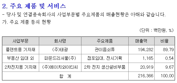 태광의 주력 사업은 산업 현장에서 사용되는 각종 배관자재와 관이음쇠류의 제조와 판매로 발전·플랜트·정유·화학 등 다양한 산업 분야에 적용되는 배관 부품을 공급하며, 산업 인프라 전반에 걸쳐 활용되는 제품군을 보유하고 있습니다
