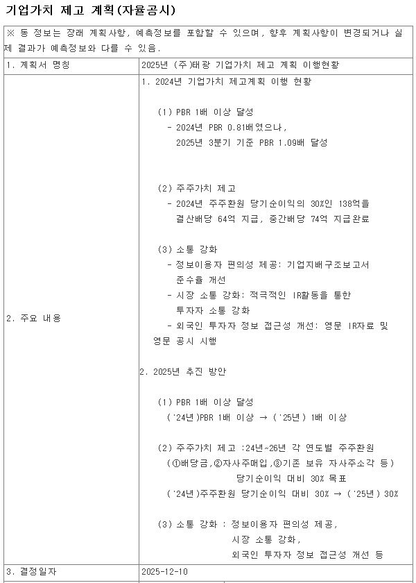 태광은 산업용 배관자재와 관이음쇠류를 제조·판매하는 기업으로 1982년 8월 1일 태광벤드공업주식회사로 설립됐으며, 1994년 9월 7일 기업공개를 실시했고 이후 2001년 3월 현재의 상호인 태광으로 변경했습니다.