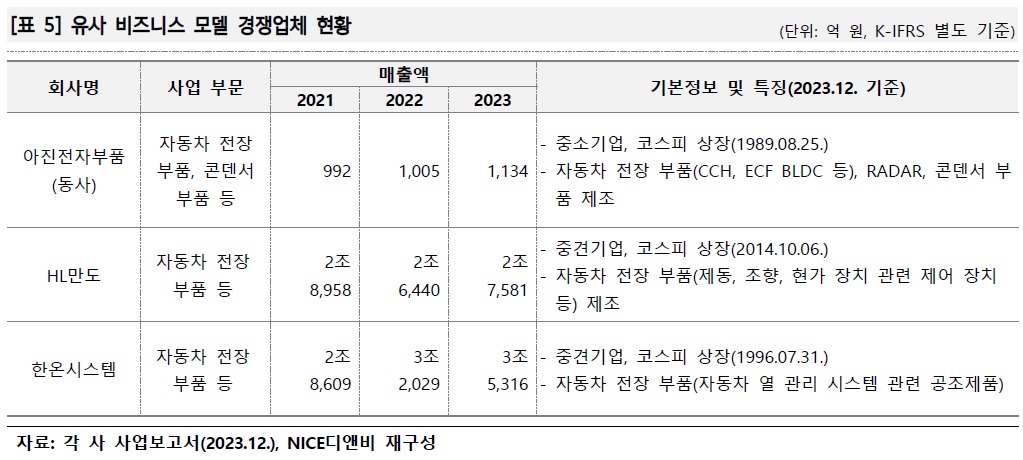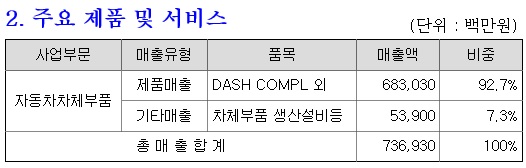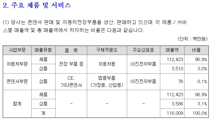 주요 제품인 자동차 전장 부품 등을 생산하는 완성차 업계의 2차 공급업체로 국내 주요거래처로는 한온시스템, HL만도 주식회사, 현대모비스 등이 있으며, 해외 수출 거래처로는 Borgwarner, Ficosa 등이 있습니다