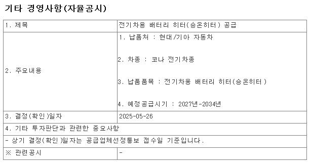 최근 현대차와 기아차의 1차협력사로 인정을 받아 전기차 배터리 승온 히터, PTC 히터 제품에 대해 직접납품을 하고 있고 장기계약이라 안정적인 실적호전이 기대되고 있는 상황입니다