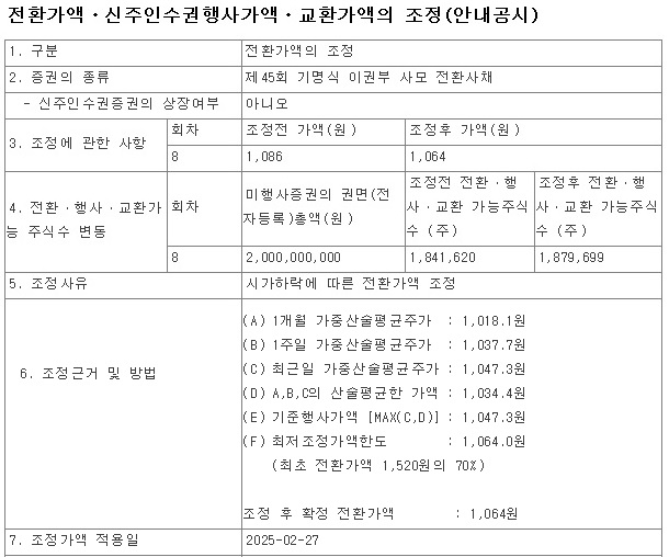 다만 아진전자부품은 8회차 전환사채에 대해 전환가격 조정이 완료되어 1,064원에 1,879,699주의 잠재물량이 대기하고 있습니다