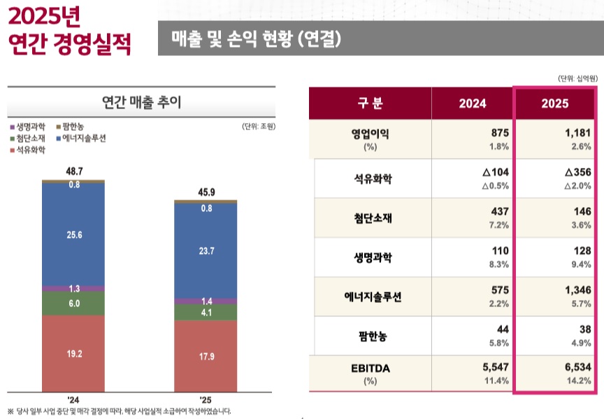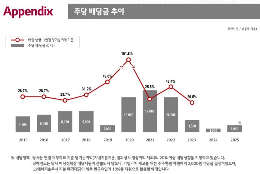 LG화학의 2025년 연결기준 매출과 영업이익은 각각 45조9320억원, 1조1809억원을 기록했는데 매출은 2024년보다 6% 줄었으나 영업이익은 35% 늘어났고 당기순손실 9770억원으로 배당 재원이 없지만 주주환원을 결정했는데 보통주 기준 총 1570억원의 배당금을 지급하기로 했습니다.