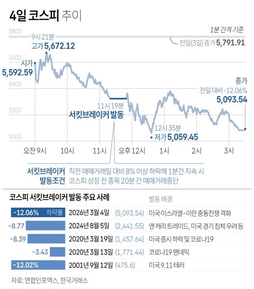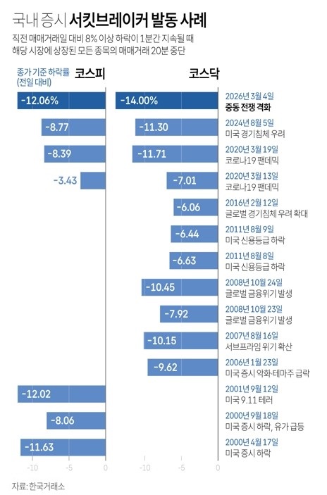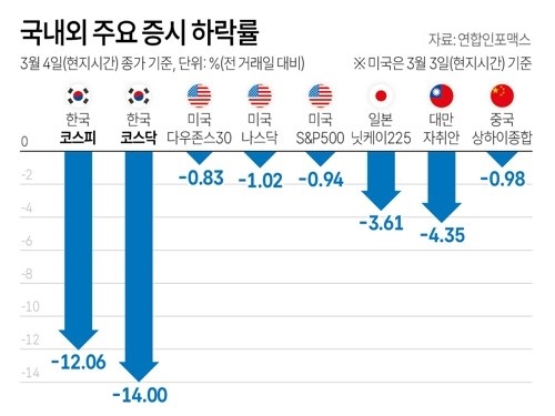 코스피는 장중 전일 종가 대비 12.64% 하락하면서 2001년 9·11 테러(12.02%)를 넘어선 역대 최대 하락폭을 기록했습니다.