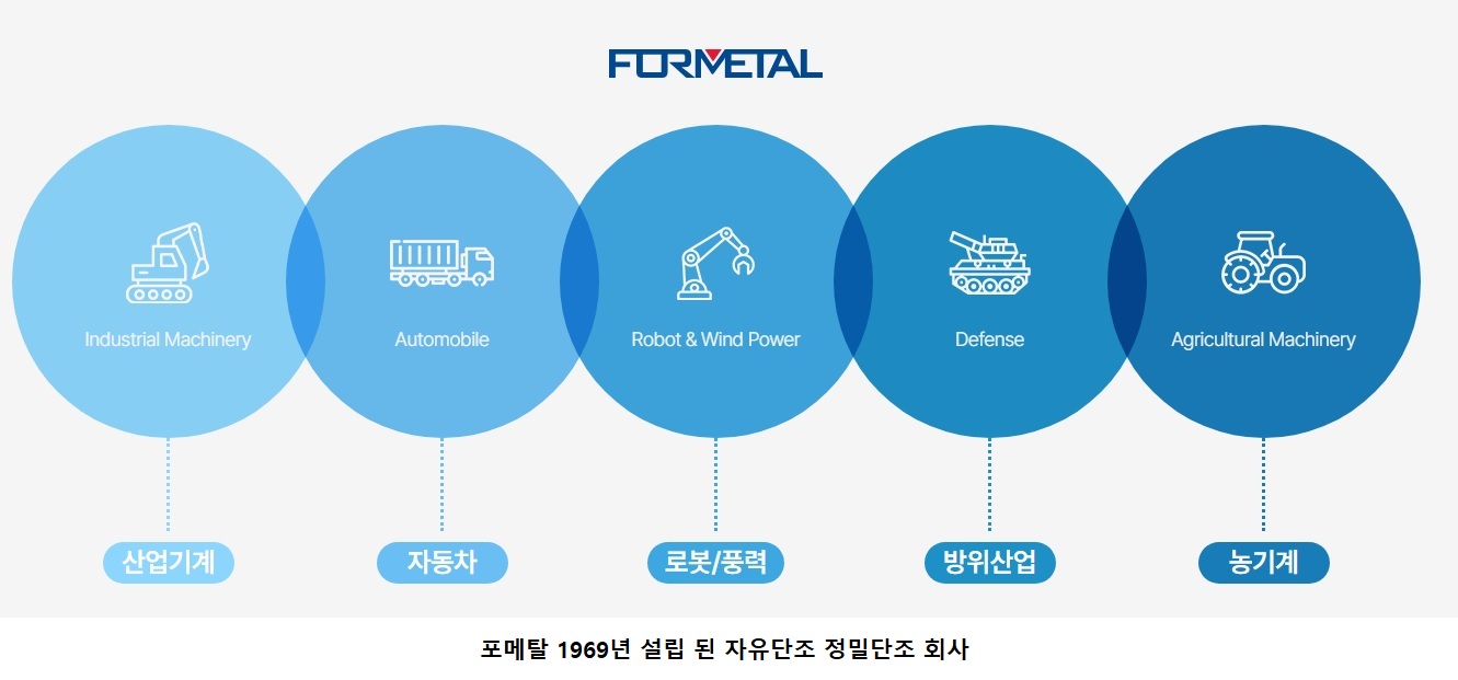 포메탈은 1969년에 설립한 단조정밀기계부품 생산 회사로 자유단조와 형단조품, 복합단조품, 중공단조품, 링기어 등의 단조품을 생산하고 있습니다