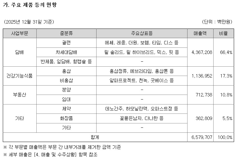 KT&G는 궐련 및 차세대 전자담배인 HNB 등의 제조와 판매 사업을 운영하는「담배사업부문」, 홍삼 및 비홍삼 건강기능식품 등의 제조 및 판매 사업을 운영하는「건강기능식품사업부문」, 부동산 개발 및 임대 사업을 운영하는「부동산사업부문」, 의약품/화장품의 연구개발, 제조, 판매 등의 사업을 운영하는「기타사업부문」으로 구분할 수 있어 전매사업이 중단된 이후에도 대한민국 대표 상품인 인삼의 해외판매가 늘어나면서 일본식 명칭인 "진생"에서 우리말인 "인삼"이 새롭게 대두되는 것처럼 존재감을 어필하고 있습니다