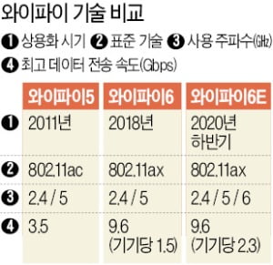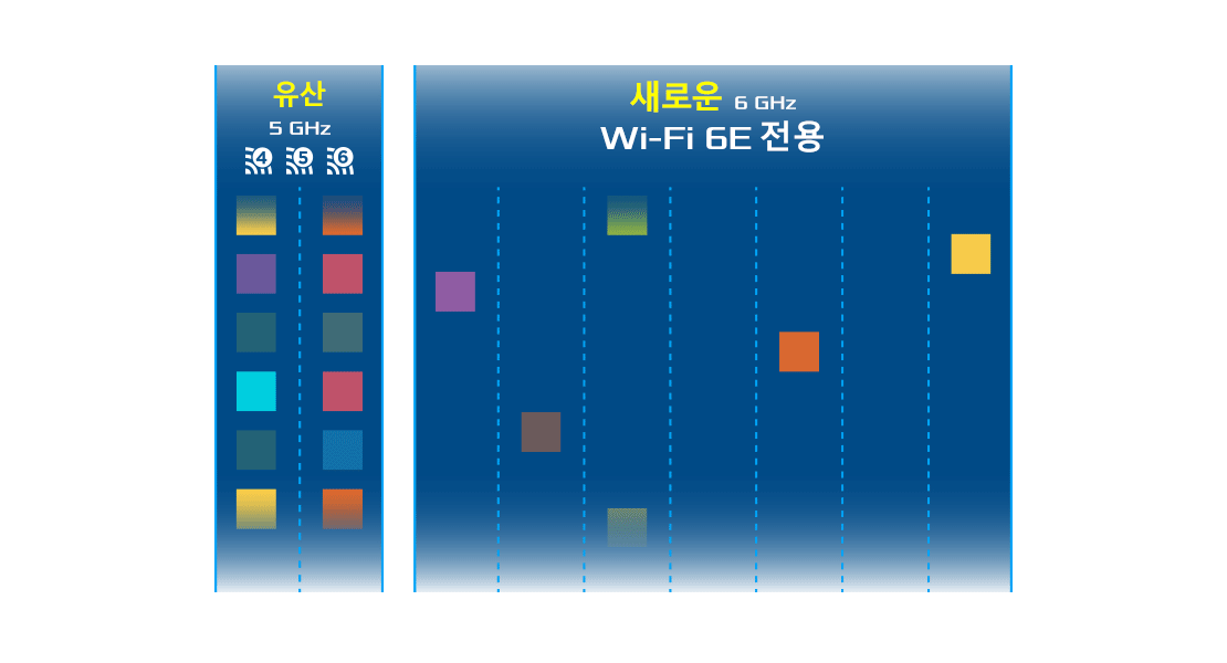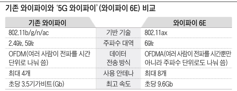 와이파이 6E는 6㎓ 대역(5925~7125㎒)까지 이용하는 와이파이 표준으로 기존 대비 최대 5배 빠른 속도와 1.5배 이상의 동시접속자 수용 능력을 자랑하는데 지난 2020년 10월 과기정통부는 세계에서 두번째로 6㎓ 대역을 와이파이 6E로 공급했습니다.