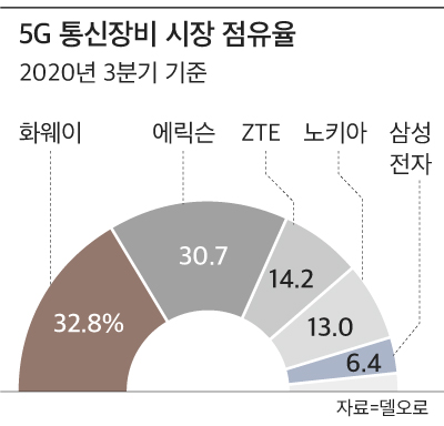 현재 5G 통신장비 시장은 화웨이, 에릭슨, 노키아가 과점하고, 삼성전자가 4위권으로 그 뒤를 추격 중인데 시장조사기관 델오로의 최근 집계에 따르면, 5G 통신장비 시장에서 삼성전자는 점유율 6.4%로 30%대를 웃도는 화웨이·에릭슨, 13%대로 3위에 올라있는 노키아의 뒤를 잇고 있습니다(중국 내수용으로만 서비스 중인 ZTE 제외).
