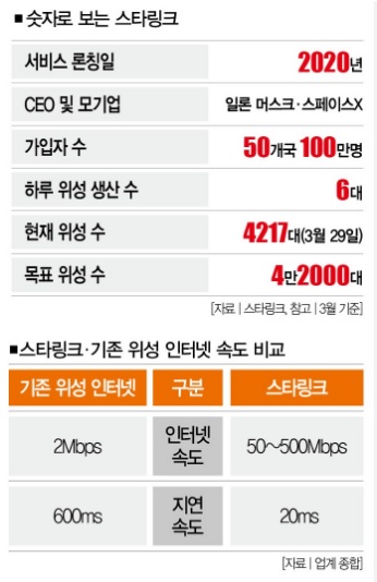 스타링크의 인터넷 서비스 속도는 기업용 기준 500Mbps(초당 비트 수)로 작년 통신 3사의 5G 평균 속도(1025.52Mbps)의 절반 수준에 그쳐 성질급한 한국인들이 이용하기에는 많이 느리고 불편한 서비스로 알려져 있습니다