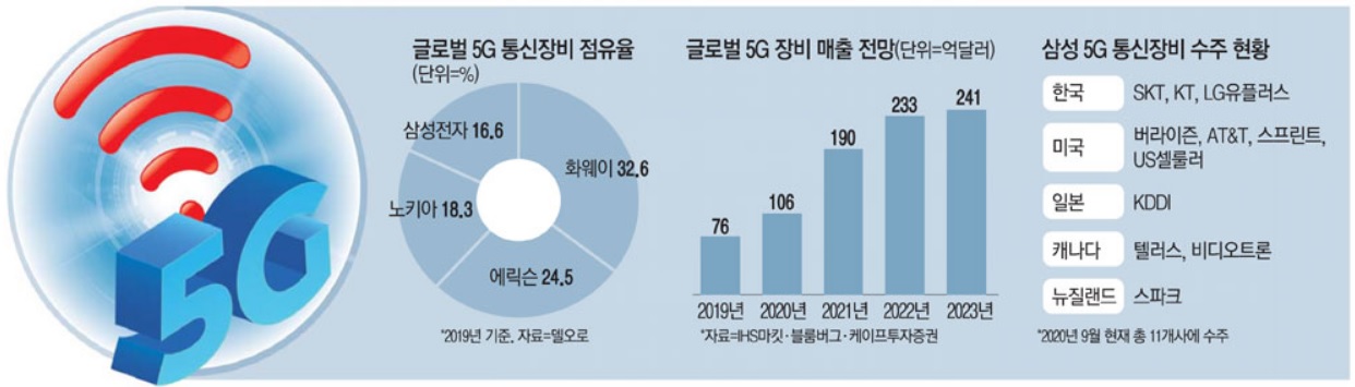 삼성전자는 지난해 9월 미국 1위 통신사업자이자 이동통신 매출 기준 세계 1위인 버라이즌과 7조9000억원(66억달러) 규모의 5G 네트워크 장비·솔루션 수출 계약을 하며 깜짝 성과를 낸 바 있습니다.